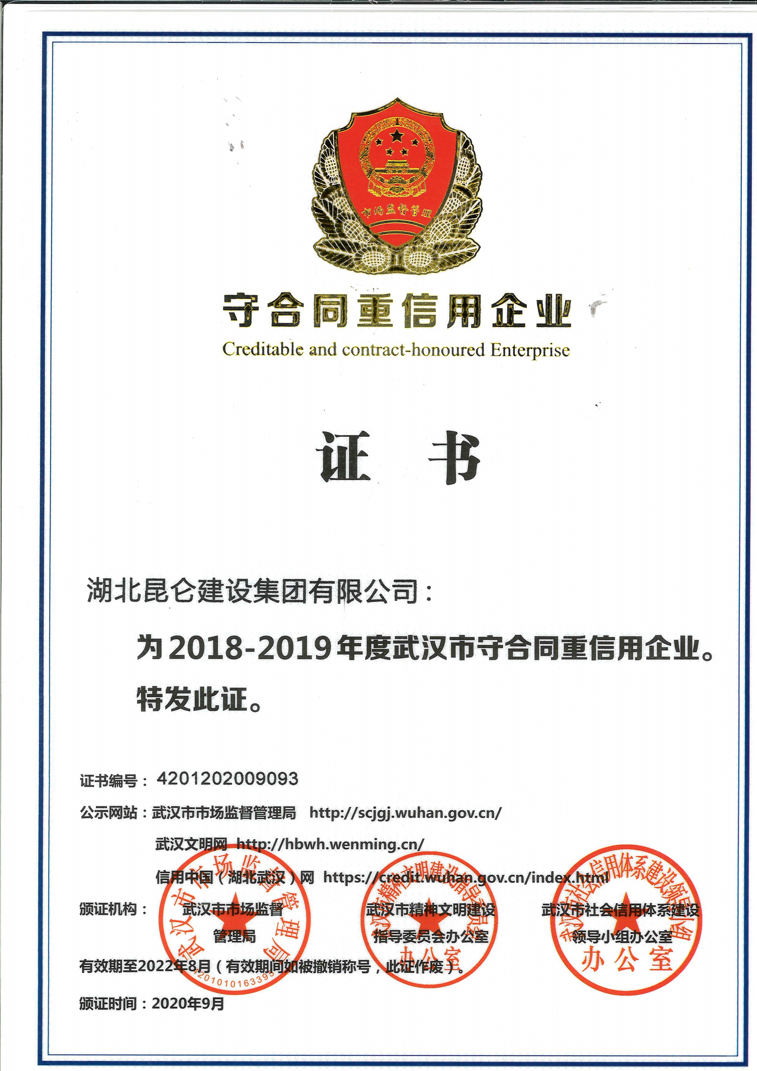 • 2018~2019年武漢市守合同重信用企業